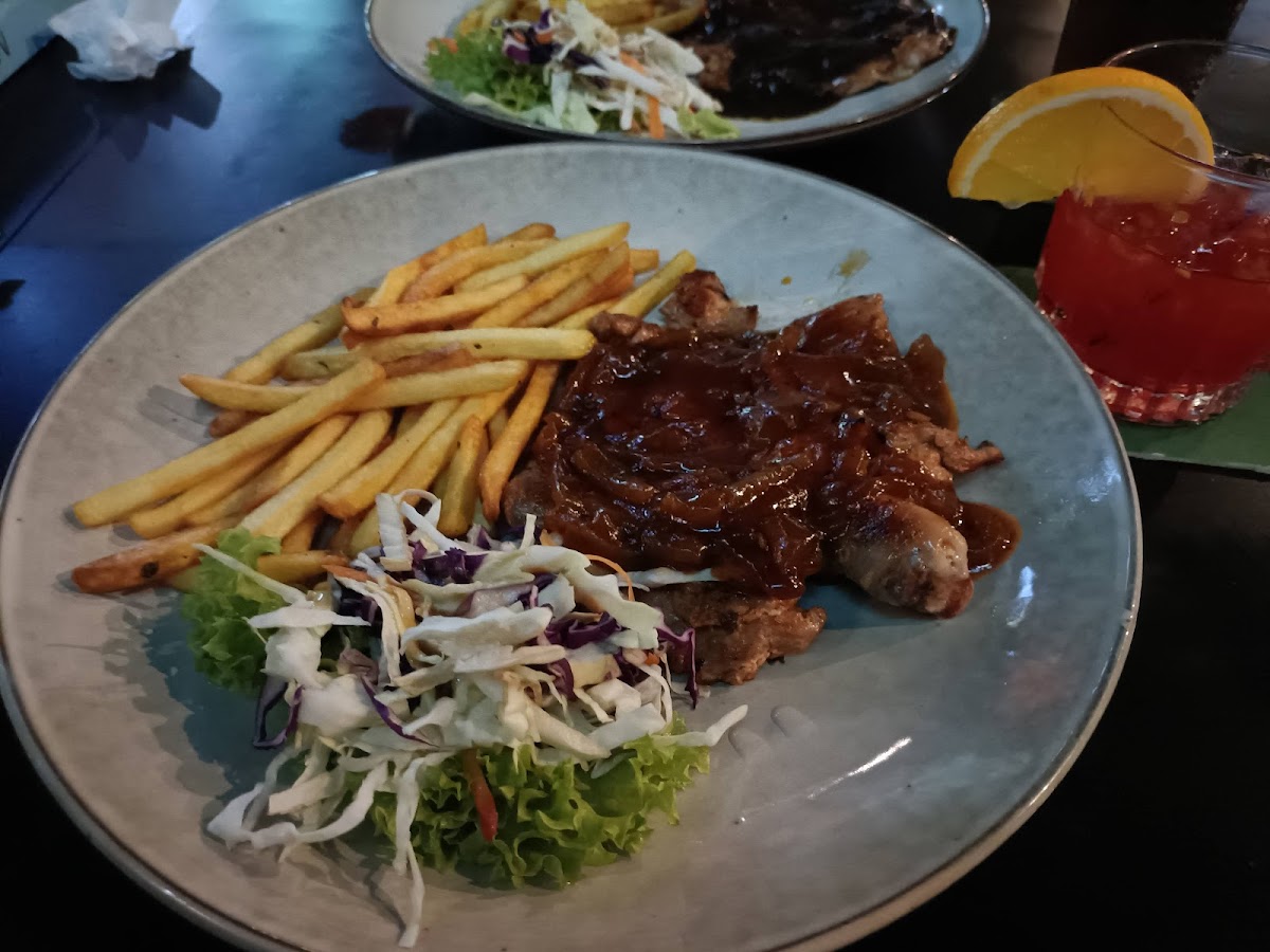 The café has an eclectic décor that reflects a fun and laid-back vibe. With music posters, vibrant album covers, and a unique nautical flair—such as a boat jutting conspicuously from one wall—it's easy to see why diners find the atmosphere both intriguing and cozy. Some even liken it to a little Tiki sanctuary, making it a great place to unwind after a day of exploring.
